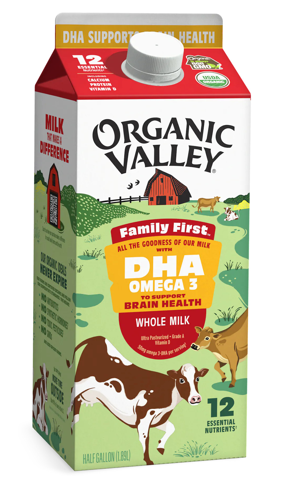 Hãy tưởng tượng một ly sữa hữu cơ hoàn hảo được nuôi trên đồng cỏ – lạnh, béo ngậy, chứa nhiều canxi và có 12 chất dinh dưỡng thiết yếu. Sau đó hãy tưởng tượng nó cung cấp 50 mg DHA omega 3 mỗi khẩu phần để hỗ trợ sức khỏe não bộ. Bây giờ bạn đã biết được chất lượng tốt nhất trong mỗi ly sữa Organic Valley Family First™.