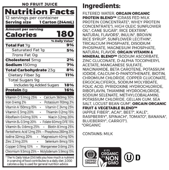 Sữa dinh dưỡng hữu cơ Orgain Kids Protein giúp bổ sung dinh dưỡng thiết yếu cho trẻ đang trong giai đoạn phát triển chiều cao và cân nặng. Trong mỗi hộp có đến 8g protein hữu cơ. Với định lượng là 3 gram chất xơ trong 1 hộp sữa được chiết xuất từ 10 loại trái cây và rau củ quả hữu cơ thật (Real Organic Fruits) như Táo, Berry, Củ Dền Đỏ, Rau Bó Xôi, Quả Mâm Xôi, Cà Chua, Chuối, Việt Quất, Cà Rốt, Cải Xoăn có thể giúp bé tiêu hoá tốt hơn, dễ hấp thụ các chất dinh dưỡng, chống táo bón. Vì thế mẹ có thể yên tâm rằng bé sẽ được cung cấp một nguồn năng lượng dồi dào cho 1 ngày vui chơi khoẻ mạnh.