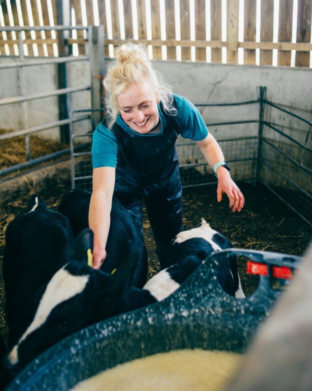 Kirsten, chuyên gia chăn nuôi đang cho những chú bò uống “sữa chua” vào buổi sáng
