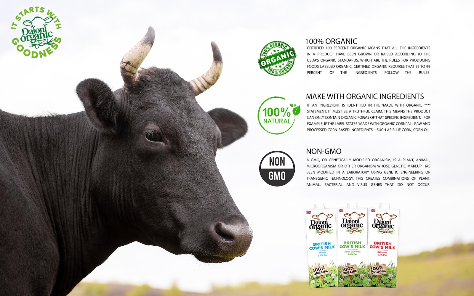 Mọi thứ mang thương hiệu Daioni Organic đều được sản xuất và đóng gói 100% tại Vương quốc Anh và được chứng nhận bởi tổ chức chứng nhận hữu cơ hàng đầu của Anh – The Soil Association: không có kháng sinh, không hormon tổng hợp, không thuốc trừ sâu độc hại và không thực vật biến đổi gen GMO.. Người tiêu dùng hoàn toàn có thể truy xuất nguồn gốc các sản phẩm sữa hữu cơ Daioni đầy đủ từ khâu chăn nuôi, chế biến, sản xuất, đóng gói và phân phối.